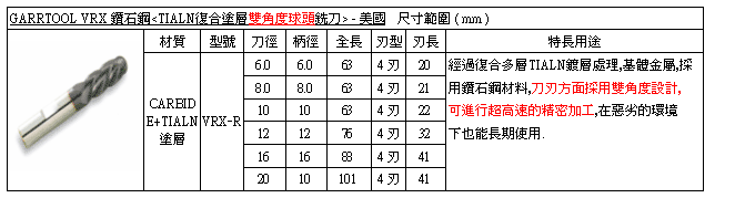 GARRTOOL VRX钻石钢-TIALN复合涂层双角度球头铣刀