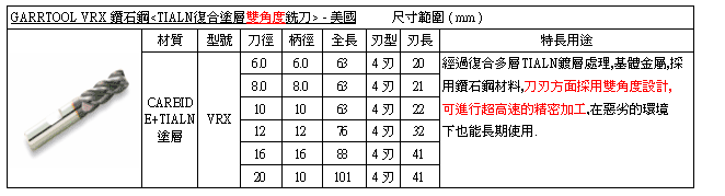 GARRTOOL VRX钻石钢-TIALN复合涂层双角度铣刀